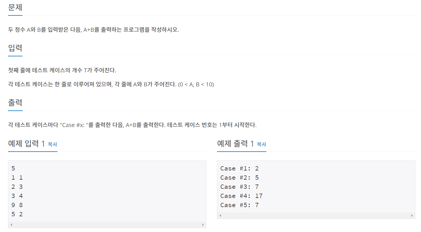 문제 자체는 어렵지 않다. 백준 10950문제와 비슷하다. >> [Python/Algorithm] - 백준 10950 : Python 입출력(3)