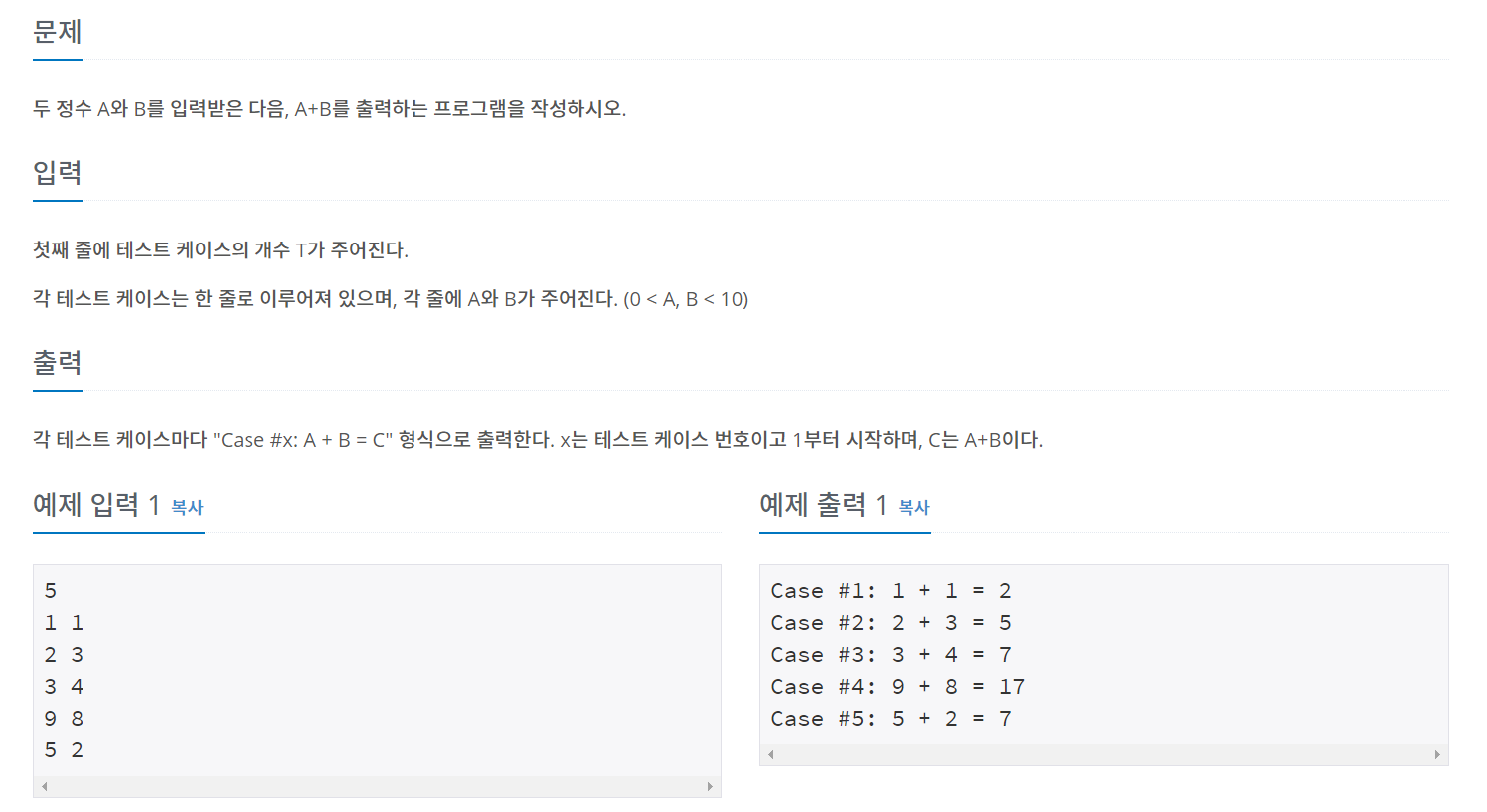 Python3 입출력 6문제를 풀면서 아 이제 입출력은 그만할까? 했다가 쭉 풀기로 마음 먹게 된 문제.. 문제 자체는 어렵지 않다. 백준 10950문제와 비슷하다. >> [Python/Algorithm] - 백준 10950 : Python 입출력