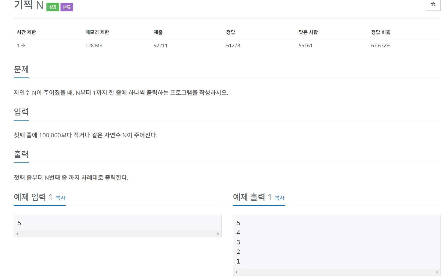 해당 문제 (2742) : https://www.acmicpc.net/problem/2742