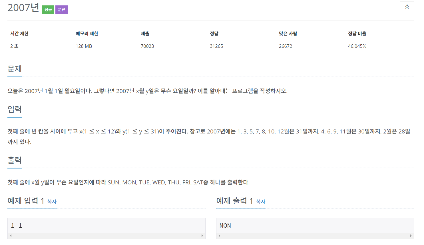 첫째 줄에 빈 칸을 사이에 두고 x(1 ≤ x ≤ 12)와 y(1 ≤ y ≤ 31)이 주어진다. 참고로 2007년에는 1, 3, 5, 7, 8, 10, 12월은 31일까지, 4, 6, 9, 11월은 30일까지, 2월은 28일까지 있다.