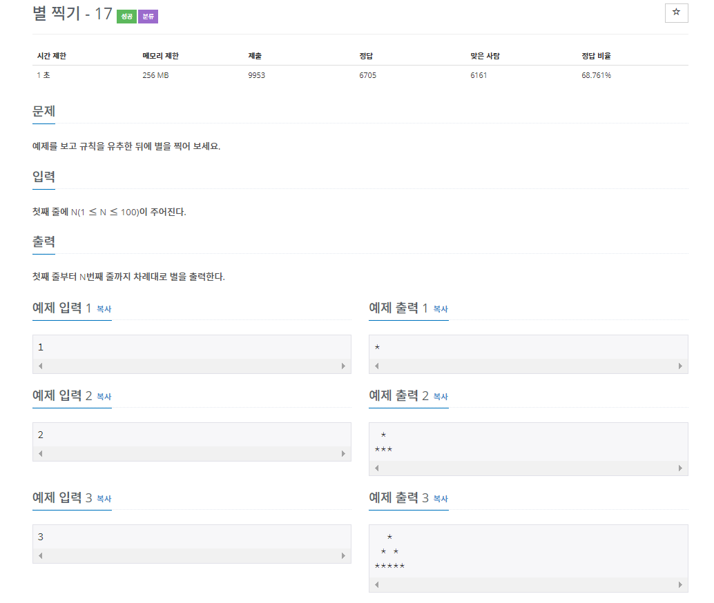 Python3 전체 코드 : N = int(input()) for i in range(N): print(' '* (N-i-1) + "*" * ((i+1)*2-1)) 이번에는 뭔가 range(N) 으로 한게 뭔가 코드가 지저분해 보이는 것 같다. N = int(input()) for i in ra..