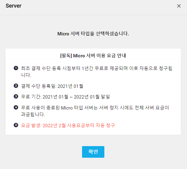 1년간 무료로 사용하려면 서버 타입은 무조건 Micro로 선택해야 한다.