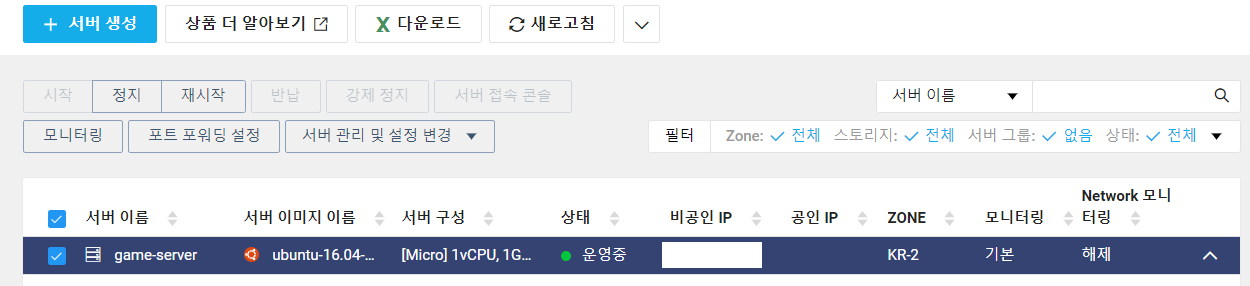 초록색과 함께 ' 운영중 ' 으로 바뀌면 해당 서버 생성이 통과가 된 것이다.