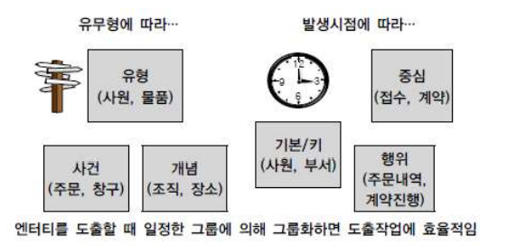 | 사건엔터티 (Event Entity) | 업무를 수행함에 따라 발생됨 비교적 발생량이 많음, 통계자료에 이용 |