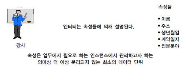 홍길동이라는 사람(엔터티)에 정보(이름, 주소, 전화번호 ...)과 같은 각각의 값을 대표하는 이름들은 속성이다.