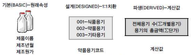 | 설계속성 (Designed) | 원래 업무상 존재하지 않음 설계를 하면서 도출해내는 속성 |