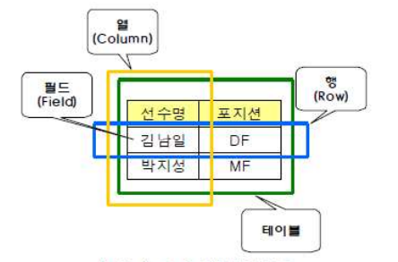 표에서 가로줄의 '선수, 팀, 팀연고지, 포지션, ... ,몸무게' 는 각각의 칼럼이 되며, 해당 테이블은 반드시 하나 이상의 칼럼을 가져야 한다.