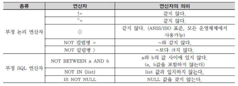 : 부정 표현을 부정 논리 연산자, 부정 SQL 연산자로 구분할 수 있다.