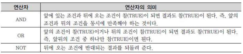 | OR | 앞의 조건이 참이거나, 뒤의 조건이 참이 되어야 결과도 참(TRUE)이 된다 |