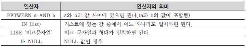 | NOT | 뒤에 오는 조건에 반대되는 결과를 되돌려 준다 | |