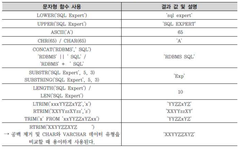 | CONCAT(문자열1, 문자열2) | Oracle, My SQL 에서 유효한 함수이며, 문자열1과 문자열2를 연결한다. 합성연산자 ' | | ' (Oracle) 나 ' + ' (SQL Server) 와 동일하다. |