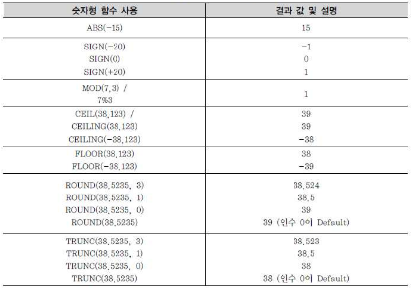 | MOD(숫자1, 숫자2) | 숫자1을 숫자2로 나누어 나머지 값을 리턴한다. MOD 함수는 %연산자로도 대체 가능함. ( 숫자1 % 숫자2 ) |