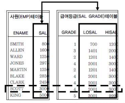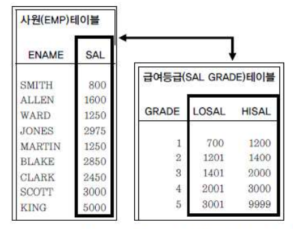 ( 사원 테이블과 가상의 급여등급 테이블 )