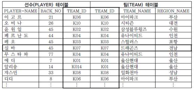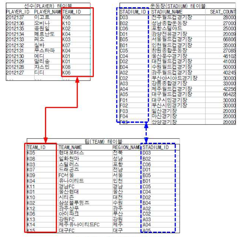 " 선수 테이블의 TEAM_ID 칼럼 " 이 " 팀 테이블의 TEAM_ID " 와 PK (팀) 와 FK (선수) 의 관계에 있다.