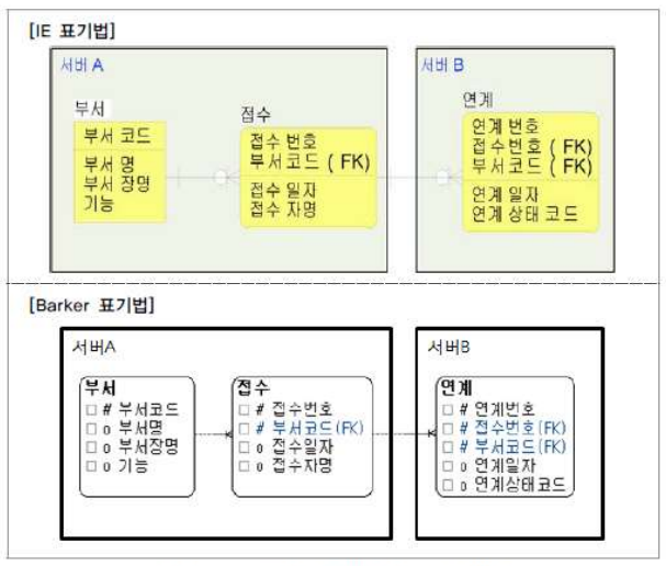 서버 A 에 부서와 접수 테이블이 있고, 서버 B 에 연계 테이블이 있다.