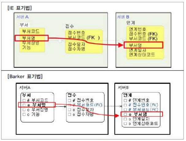 서버 A 의 부서테이블의 부서명을 서버 B 의 연계테이블에 부서명으로 속성 반정규화를 하면 조회 성능을 향상시킬 수 있다.