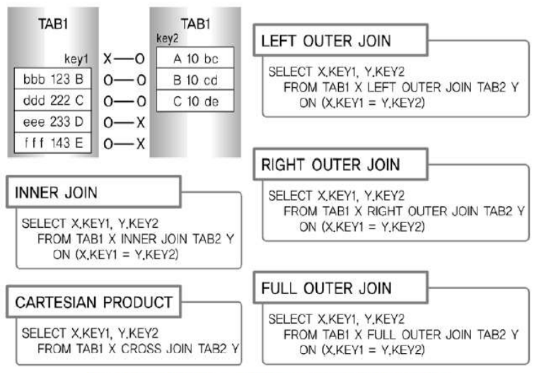 - INNER JOIN - NATURAL JOIN - USING 조건절 - ON 조건절 - CROSS JOIN - OUTER JOIN