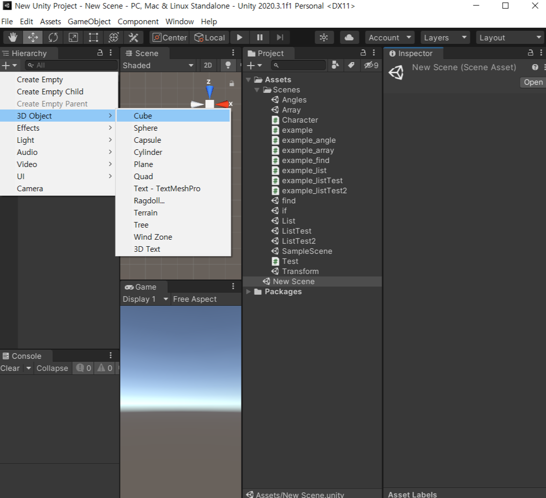 사진 속 많은 Asset 의 Scene 들은 무시하고 < New Scene > 만 보시길.
