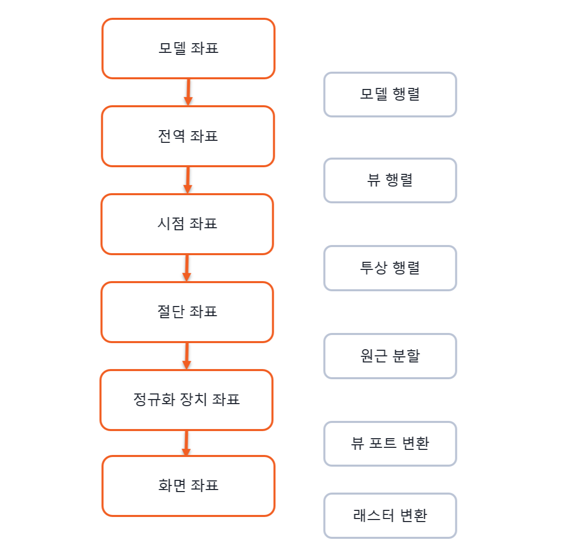 : 3차원 모델 좌표계의 정점들을 2차원 화면 좌표계로 변환하는 과정