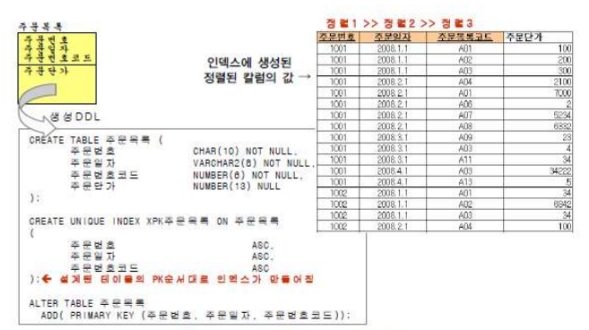 ( 데이터 모델의 PK 순서에 따라 DDL이 그대로 생성되고, 테이블의 데이터가 주문번호-주문일자-주문등록코드 가 정렬된다. )