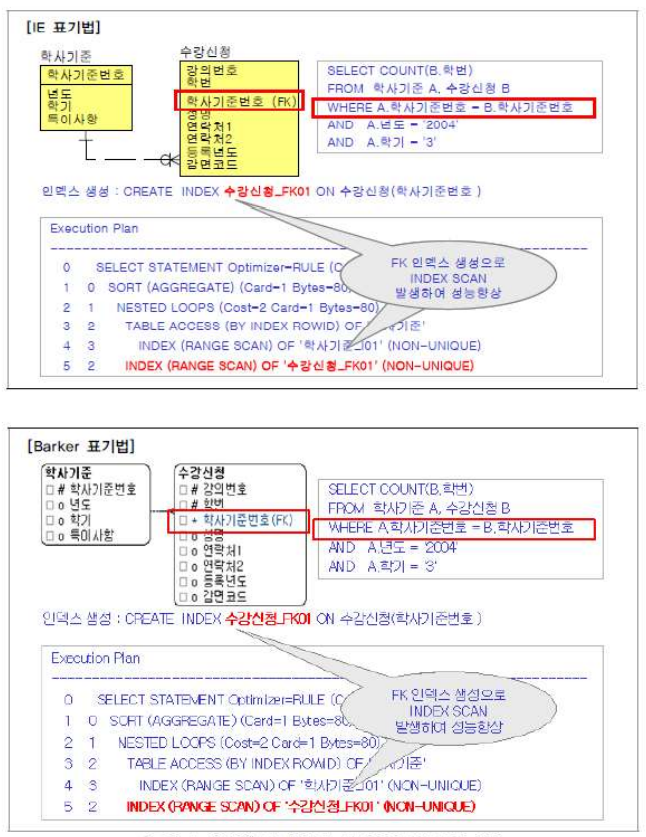 물리적으로 연결되어 있지 않아도, '학사기준' 테이블로부터 상속받은 FK 에 대해 FK 인덱스를 생성함으로써 SQL 문장이 조인이 발생할 때 성능저하를 막을 수 있다.