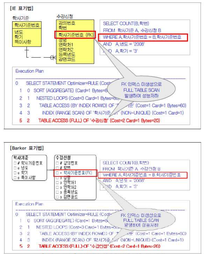 '수강신청' 테이블의 학사기준번호가 SQL WHERE절에 비교자로 들어오지는 않았지만, '수강신청' 테이블에서 상속받은 학사기준번호에 대해 인덱스를 생성하지 않아서 '학사기준' 테이블과 '수강신청' 테이블이 JOIN 되면서 '수강신청' 테이블이 FULL TABLE SCAN 이 발생되어 성능이 저하되었다.