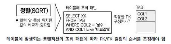 PK/FK 설계는 데이터를 접근할 때 경로를 제공하는 성능의 측면에서 중요한 의미이므로, 성능을 고려한 데이터베이스 설계가 될 수 있도록 설계단계 말에 칼럼의 순서를 조정할 필요가 있다.