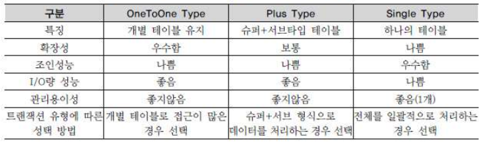 따라서 슈퍼타입과 서브타입을 묶어 트랜잭션이 발생하는 업무 특성에는 슈퍼타입+서브타입을 하나로 묶어 별도의 테이블 구성을 한다.