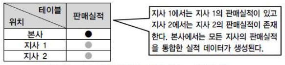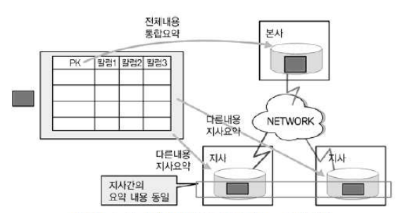 ◎ 통합요약 : 각 지사별로 존재하는 다른 내용의 정보를 본사에 통합하여 다시 전체에 대해서 요약정보를 산출하는 분산방법