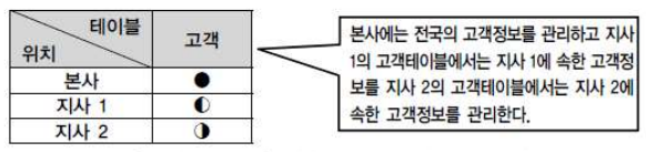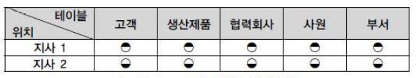 지사별로 '고객', '생산제품', '협력회사', '사원', '부서' 테이블이 '지사1' 과 '지사2' 에서 일의 시작과 끝이 항상 다르게 발생하면 각 테이블은 지사별로 수평분할 하여 표와 같이 생성된다.