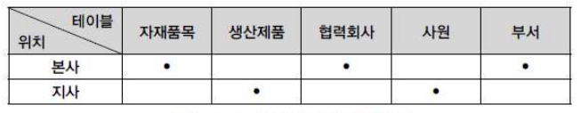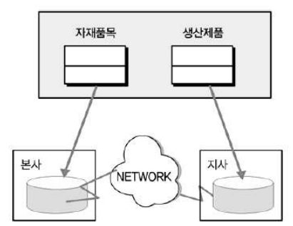 '자재품목'은 본사에서 구입/관리 , 각 지사별로 '자재품목'을 이용하여 제품을 생산한다고 하면 데이터베이스를 '본사'와 '지사' 단위로 분산시킬 수 있다.