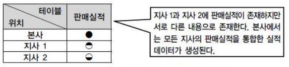 '지사1' 과 '지사2' 가 동일한 제품을 취급하므로, 본사에서 '판매실적'을 집계할 경우 통합된 '판매실적'을 관리한다.