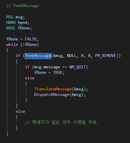 - 게임 메세지가 없어도 계속적으로 처리해야 된다면, PeekMessage 를 사용하여 렌더링을 해주는 식으로 사용한다.